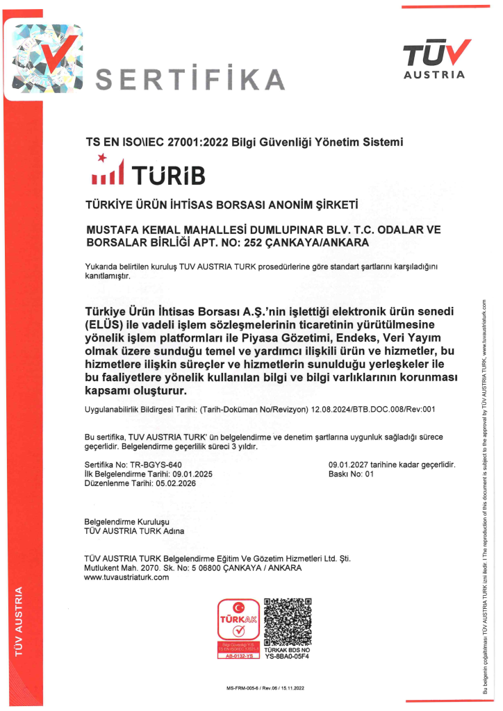 TÜRİB, Bilgi Güvenliği Yönetim Sistemi (BGYS) kapsamında; işlettiği piyasalar ve bunlara yönelik sunduğu temel ve yardımcı ilişkili ürün ve hizmetler, bunlara ilişkin süreçler ve sunulduğu yerleşkeler ile bu faaliyetlere yönelik kullanılan bilgi ve bilgi varlıklarının güvenliğini sağlamayı teminen;