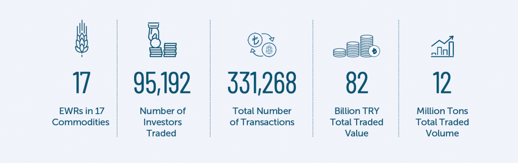 EWR is an electronic receipt that represents agricultural products stored in licensed warehouses and can only be traded in TMEX EWR Market. The market primarily trades grain such as barley, wheat, and corn. 17 distinct products including grain, legumes, oilseeds, pistachios, hazelnuts, dried apricots, cotton, and olives are tradable in the TMEX EWR Market.
