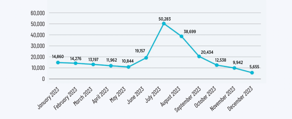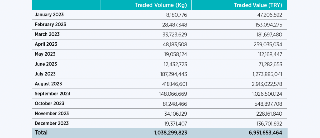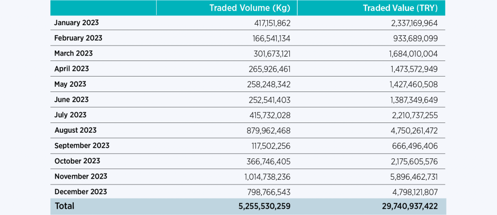 Turkish Mercantile Exchange (TMEX) has launched its Electronic Warehouse Receipt (EWR) Market on July 26, 2019. In 2023, EWR Market reached a trading volume of 12 tons and a total trading value of 82 million Turkish liras in more than 331 thousand EWR transactions. Since TMEX commenced operations, it has recorded more than 1 million EWR transactions, with over 216 thousand registered investors a trading volume of 40 million tons and trading value of 182 billion Turkish Liras.