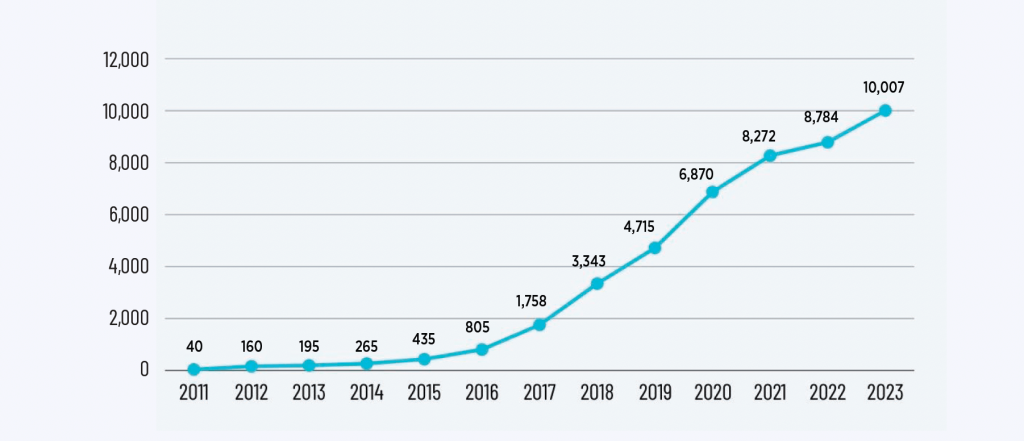 of commodity trading systems. In Türkiye, 186 licensed warehouses provide service in 45 provinces, 136 districts and 261 di erent locations with a storage capacity of 10 million tons as of the year-end 2023. The total licensed warehouse storage capacity, which used to be 4 million tons when TMEX commenced operations, increased greater than 2.5-fold in 4 years, reaching to a capacity potentially storing one-fourth of Türkiye’s total grain harvest.